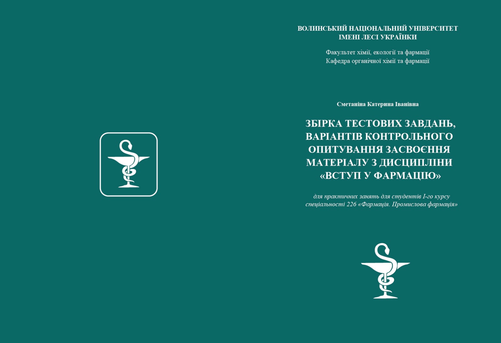 | Bibliographic description (Ukraine): | Сметаніна К. І. Збірка тестових завдань, варіантів контрольного опитування засвоєння матеріалу з дисципліни «Вступ у фармацію» для практичних занять для студентів І-го курсу спеціальності 226 «Фармація. Промислова фармація» . Луцьк : Завжди Поруч, 2022. 122 с. |